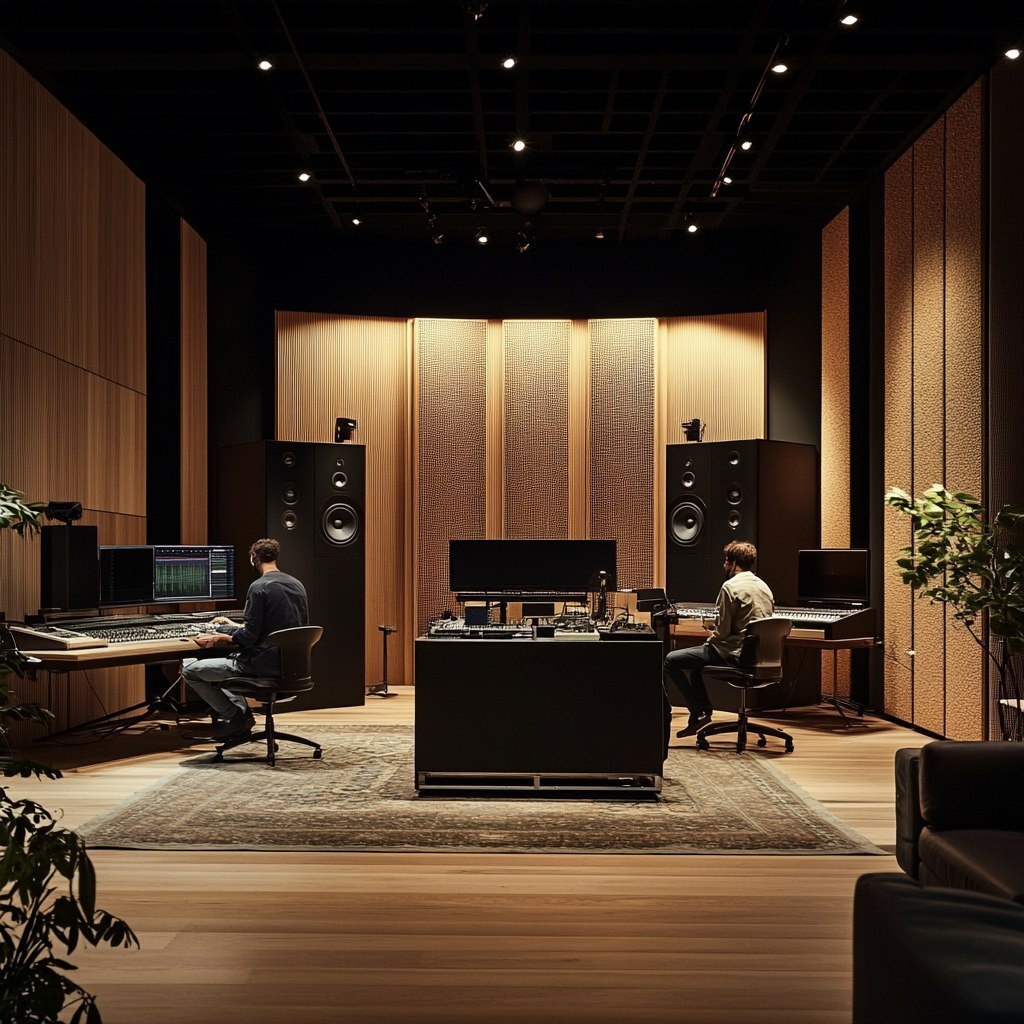 Создано на основе запроса: Bang & Olufsen music studios with their products and their design aesthetic but moodier and vibey with music
