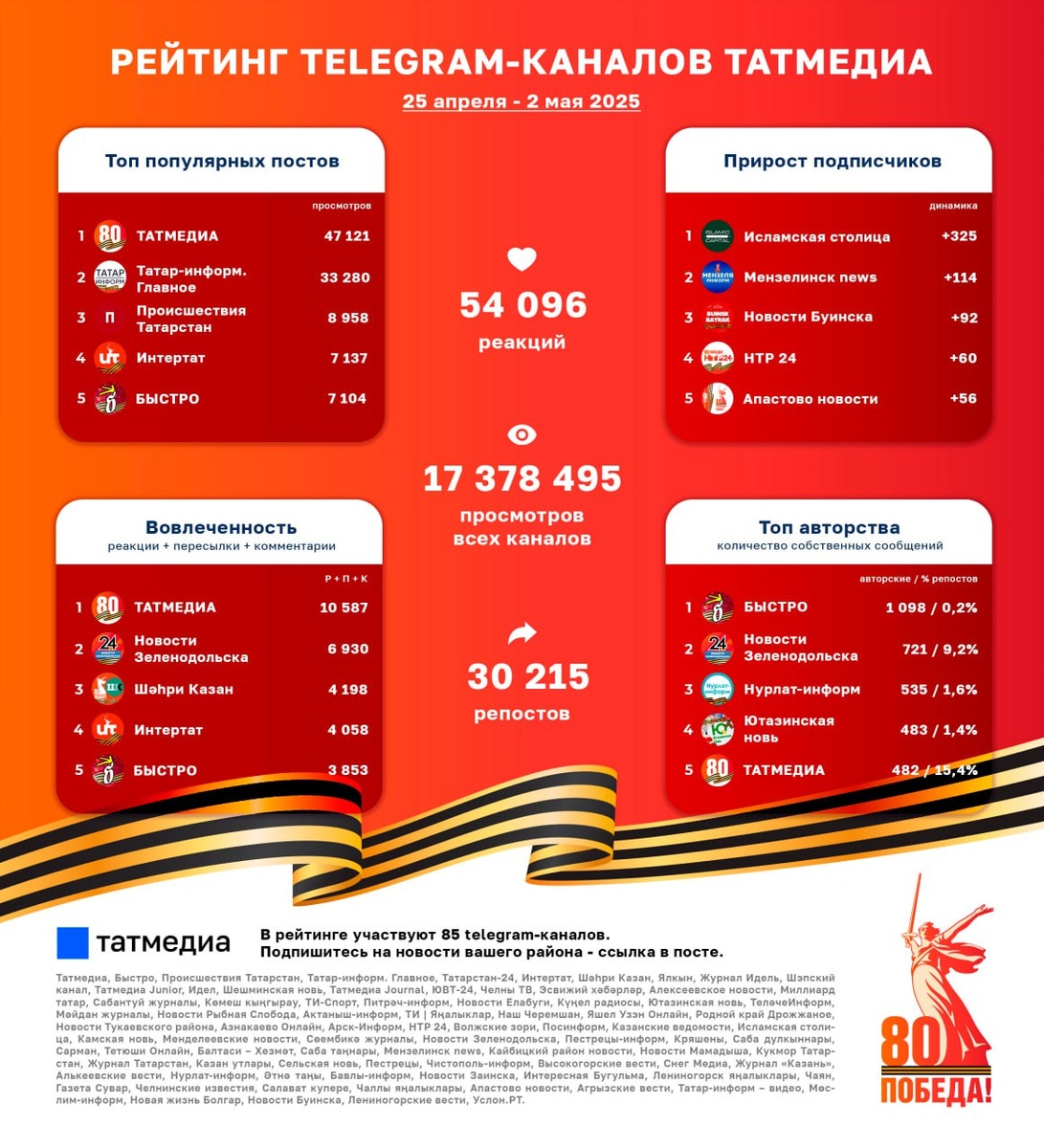 В ответ на пост 📊📱Обновлённый рейтинг каналов Татмедиа | 25 апреля – 2 мая ТОП-5 самых просматриваемых каналов: 1. ТАТМЕДИА - 2 550 526 2. Новости Зеленодольска - 1 277 699 3. БЫСТРО - 1 108 025 4. Интертат - 860 643 5. Нурлат-информ - 766 857 ТОП-10 самых популярных постов: 47 121 🔹 ТАТМЕДИА: Нейросети оживили татарстанские памятники и монументы Победы в ВОВ. 33 280 🔹 Татар-информ. Главное: Минниханов подписал закон о требованиях к кандидатам на пост Раиса Татарстана. 8 958 🔹 Происшествия Татарстан: Проблемы с электричеством на улице Чуйкова. 7 137 🔹 Интертат: Тукай премиясе лауреатлары - 2025. 7 104 🔹 БЫСТРО: Путин объявил перемирие в дни 80-летия Победы. 5 472 🔹 Сөембикә: Интервью с Габдуллой Тукаем с помощью ИИ. 4 791 🔹 ТИ-Спорт: Анвар Гатиятулин рассказал о своём будущем в «Ак Барсе». 4 723 🔹 Шәһри Казан: Победители вузовских соревнований по борьбе в Казани. 4 304 🔹 Высокогорские вести: 24 апреля в концертном зале УНИКС состоялся заключительный этап фестивал