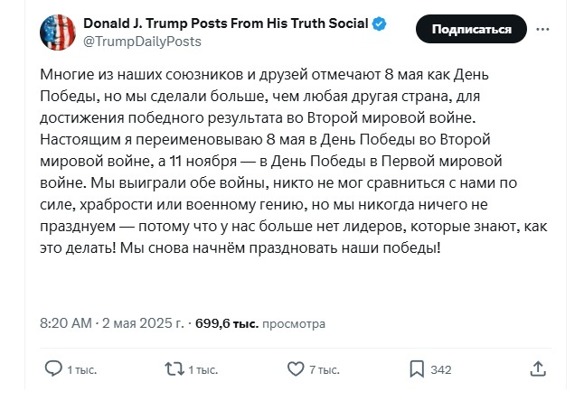 Переписывание истории в прямом эфире. Именно так видится очередное резонансное заявление президента США Дональда Трампа. В социальной сети Х он прямо заявил, что США сделали больше всех для победы в мировых войнах. Отныне в США появилось 2 новых праздника. 11 ноября - День Победы в Первой мировой войне. 8 мая - День Победы во Второй мировой войне. Комментарии иностранцев под данным постом Трампа: Ticker25 (271 лайк): Alaskan BadgerGander (24 лайка): Republican (358 лайков): Larry1915 (80 лайков): cameron🌺 (44 лайка): Jim Tune (1 лайк): Albirdly 🚽 (0 лайков): MetaRyuk (1 лайк): The Rationalist (22 лайков): Eric Sloan (1 лайк):