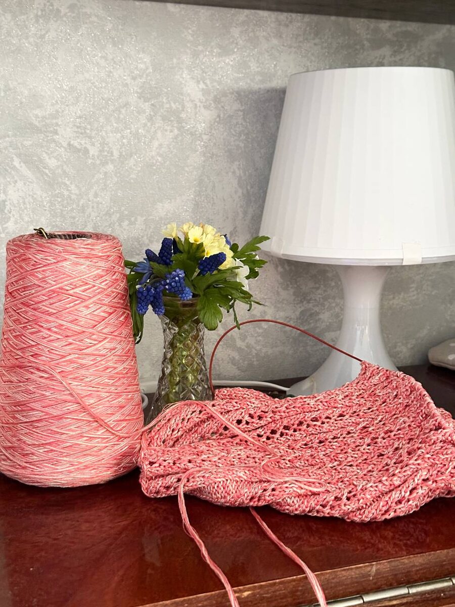Светит солнышко, а я вяжу футболку с колосками, смотрю 4 сезон Настоящего детектива и наслаждаюсь ароматом цветочков, которые подарил сын ❤️