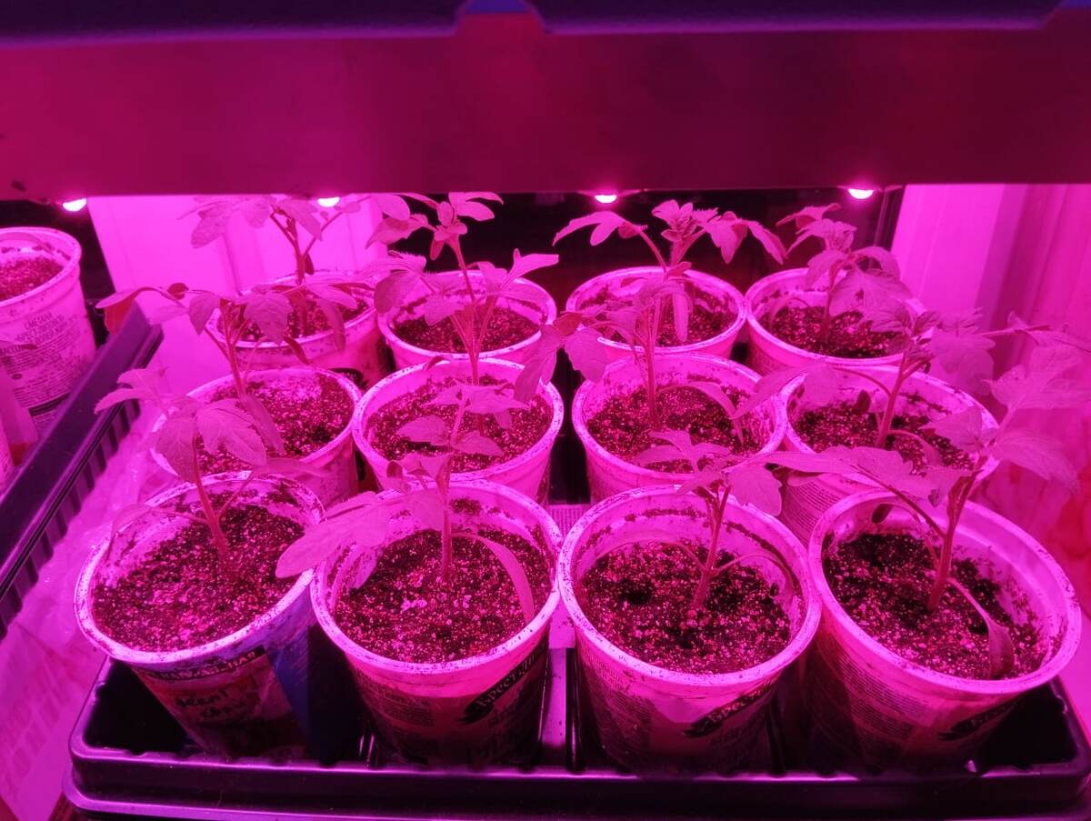 можно фильму про Барби-огородницу снимать. Поток стал откровенно розовым. Деградация люминофора приводит к изменению спектра. Поскольку рассада к стеклу не клонится световой поток вроде бы остаётся достаточный. Но красной компоненты в нём стало явно меньше. Критично это или нет понятия не имею. Теоретически рассада должна тянуться сильнее в таком варианте. Так что поставлю лампу с монохромными кристаллами от греха подальше. Оно то сила науки в эксперименте, но мне помидоры нужны, а не возможность этими экспериментами баловаться.