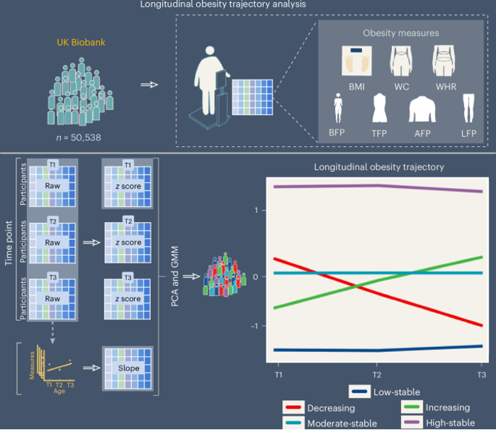 Ожирение ассоциируется с риском сердечно-сосудистых заболеваний и диабета, но как оно влияет на мозг? Крупное исследование, опубликованное в Nature Mental Health, раскрыло тревожную связь между длительным ожирением, изменениями в структуре мозга и снижением когнитивных способностей у взрослых. Ученые проанализировали данные более 50 тысяч человек из Британского биобанка и выявили пять типов «траекторий ожирения». Оказалось, что у людей с устойчиво высоким весом наблюдаются самые серьезные повреждения мозга, в то время как снижение массы тела даже в зрелом возрасте способно минимизировать риски. Графический абстракт статьи, демонстрирующий подходы к сбору данных и результаты линейной регрессии между временными точками. Credit: Zhang D. et al. in Nature Mental Health Исследователи использовали не только индекс массы тела (ИМТ), но и окружность талии, соотношение талии и бедер, а также процент жира в разных частях тела, чтобы получить полную картину ожирения 50 538 человек. Данные собирал