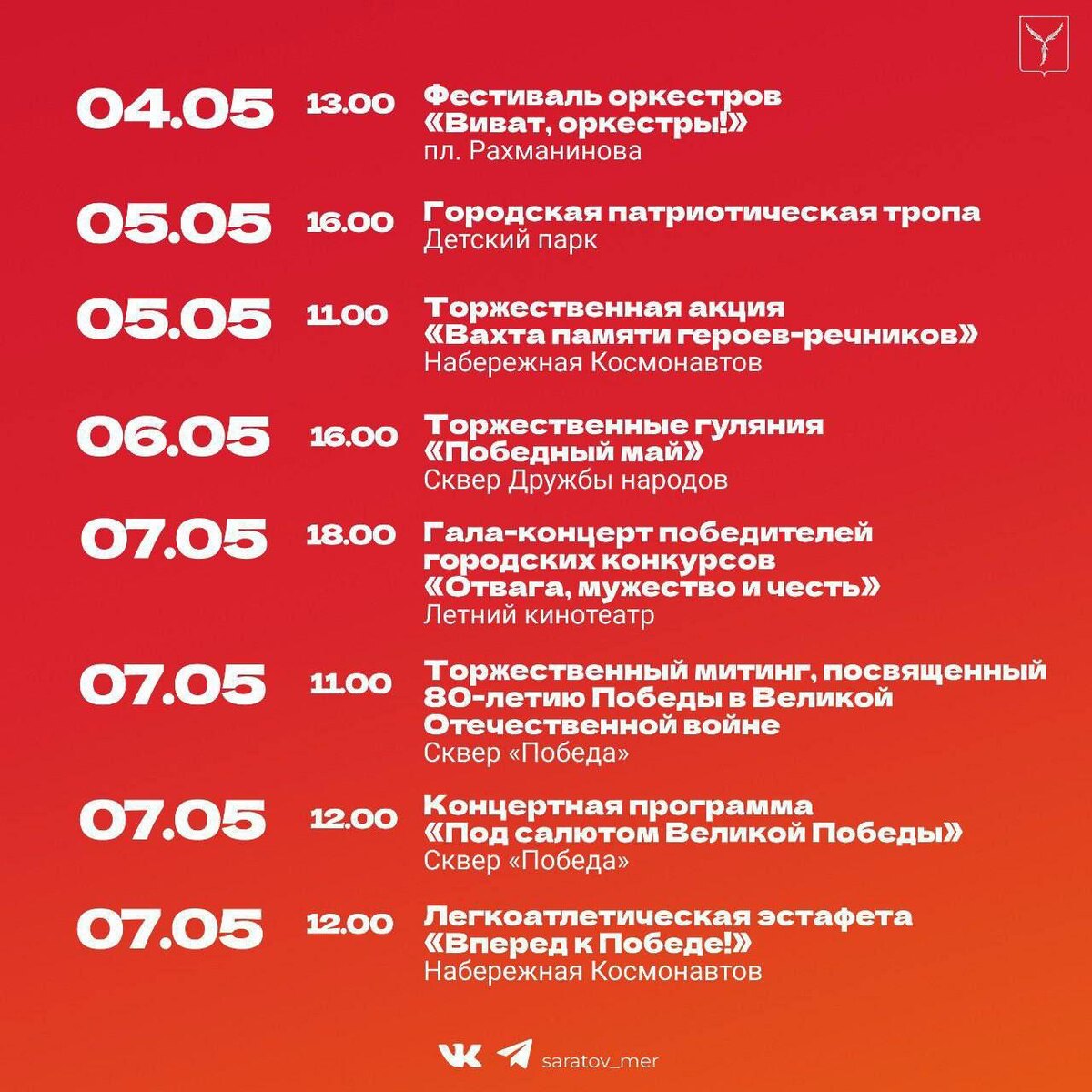 🎗 Городские праздничные мероприятия к 80-летию Победы Мэрия поделилась афишей событий с воскресенья по пятницу. Можно заметить, что в этом году 9 мая будет праздничный фейерверк на Театральной площади. На афише не указано, но ещё 8 мая на въезде в Парк Победы откроют памятник Марии Лиманской, известной как Бранденбургская Мадонна. @relaxsaratov