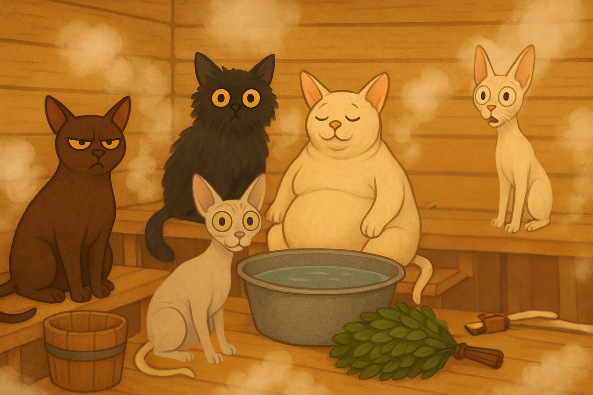 Сфинксов купать надо. Это не прихоть, это гигиена. Но можно сделать из этой процедуры ритуал — с лаской, разговорами, вкусняшкой после и чёткой системой. Тогда даже пятерых искупать — не катастрофа, а вечер в стиле “любовь и мыло”.