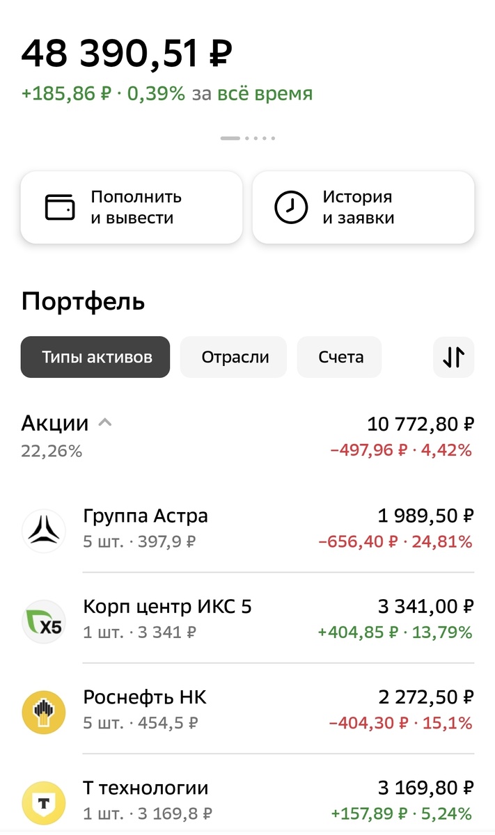 Sell in May and go away Давняя биржевая мудрость. Сработает ли она в этом году. По всей видимости все к этому и идет. Нефть уже ниже 60, рубль\доллар болтается в районе 80 и что то мне подсказывает, что дальше будет только хуже. Вот на этой неделе Минфин пересмотрел прогноз бюджета на этот год. Да пересмотрел его уж в 3 раза. Но не в сторону увеличения доходов, нет, а в сторону его дефицита. И ничем хорошим такая ситуация для предприятий точно не грозит. Вон, ВТБ даже дивиденды выплатить решил. Хотя даже и близко такого в планах, судя по официальным новостям у них не было. Но вернемся на землю грешных инвесторов и зафиксируем, что же творится с портфелем. Начнем со Сбера. Тут все без изменений. Пока пополнять ИИС не планирую. Все таки основа у меня это ТБанк. Портфель просел и просел хорошо по сравнению с прошлым периодом. Все дело в позиции на долларовый фьючерс, который я набирал еще от 98 и ниже. Но ничего, скоро он еще свое покажет, не долго ему осталось. Пришли мои любимые дивы п