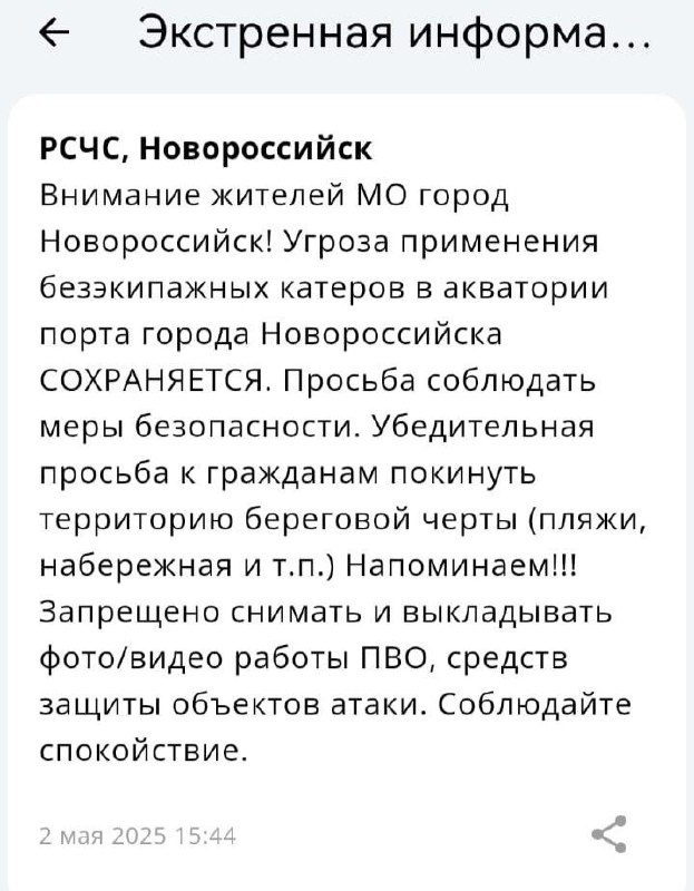 ❗️Для безопасности жителей и гостей города-героя в Южном районе и Мысхакском с/о проводят работы по эвакуации людей с пляжных территорий. Ещё раз напоминаем для жителей первой береговой линии: 🔴Если вы находитесь дома – не подходите к окнам. Укройтесь в комнате, окна которой не выходят на море или в помещениях без окон со сплошными стенами (коридор, ванная, туалет, кладовая). 🔴 Не находитесь на открытом пространстве около моря. ❗️Просьба сохранять спокойствие и следить за официальными сообщениями! Сигнал отменят сразу, как обстановка станет безопасной! ❗️Запрещено снимать и выкладывать фото/видео работы ПВО, средств защиты объектов атаки, работы специальных и оперативных служб в социальные сети. 📲 @nvrsk_online