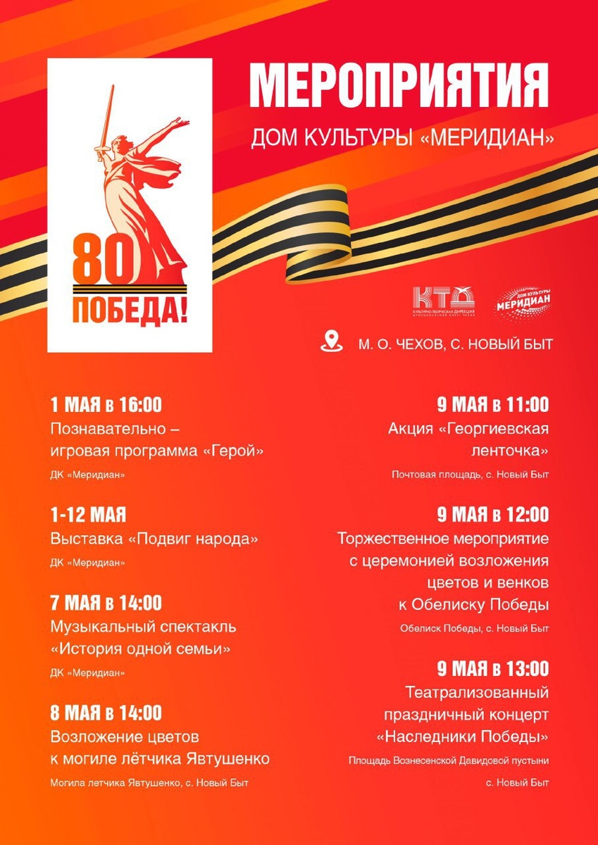 ✨ Мероприятия в преддверии праздника День Победы с 5 по 7 мая 🗓️с 5 мая по 7 мая в Чеховском округе пройдут торжественные возложения, и праздничные концертные программы, наполненные музыкой и радостью. 🗓️ 7 мая во Дворце культуры Дружба г. Чехов пройдет бесплатный концерт, посвящённый 80-летию Победы, а после концерта - Арт-кафе с песнями под баян (500р) Подробнее в афишах🌟 Присоединяйтесь 🌟 🪙 Вход свободный❗️ ✅ Мероприятия Чехов https://dzen.ru/id/66cc4b48e9ef144699238a51 http://vk.com/chekhov_events http://dzen.ru/chekhov_events
