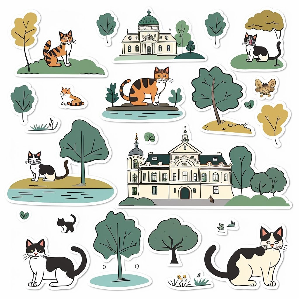Создано на основе запроса: A5 sticker sheet on a white background, colorful small stickers with visible cut-out lines between them, featuring funny cartoon cats walking, sitting or playing near the pond in front of the Belvedere Palace in Vienna the palace must be recognizable with its baroque architecture and dome towers cats in cute and silly poses kid-friendly, flat vector illustration style white sticker outlines, clean layout --- Автоперевод: A5 Sticker Sheet на белом фоне, красочные маленькие наклейки с видимыми вырезами между ними, в которых представлены забавные мультяшные кошки, ходящие, сидеть или играть у пруда перед дворцом Belvedere в Вене, дворец должен быть узнаваемы с его барочной архитектурой и куполами башни в милых и глупых поза Как тебе эта картинка? 🤔 https://dzen.ru/id/65c0c65c86e4f837c27b24d7 #ИИ #AI #нейросеть #midjourney #art