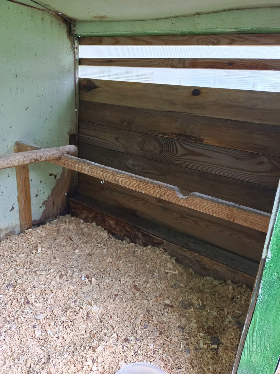 Заднюю стенку, где раньше были гнёзда — заколотил сплошную. По верху лишь поликарбонат пустил, для утреннего света. Греющий кабель, что в гнёздах был пустил по полу. Поверху насыпал песка и на неё уложил керамическую плитку. Без раствора. Весь пол покрыл опилками.