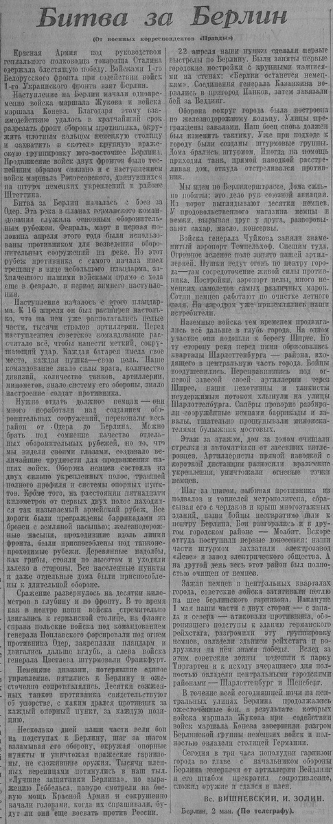 Красная Армия под руководством гениального полководца товарища Сталина одержала блестящую победу. Войсками 1-го Белорусского фронта при содействии войск 1-го Украинского фронта взят Берлин.