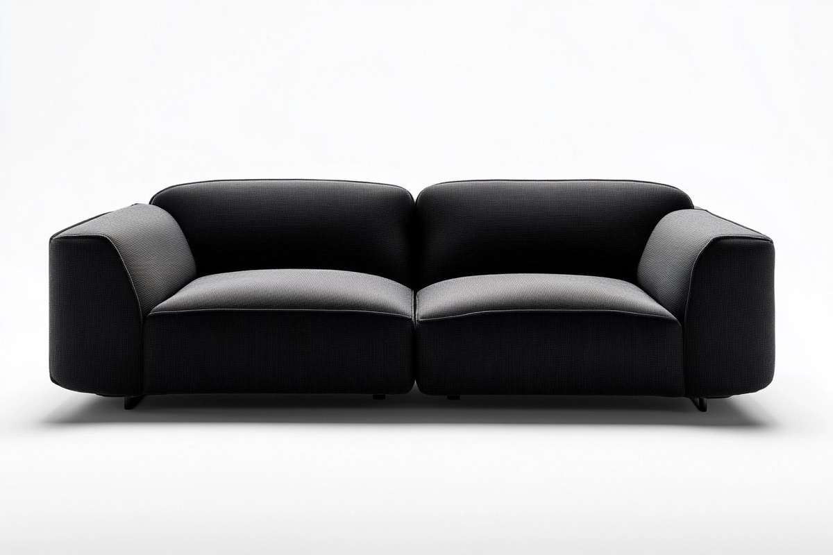 Создано на основе запроса: black 2 seater sofa, modern, leather fabric, stiff soft seating, modular base, white background studio product