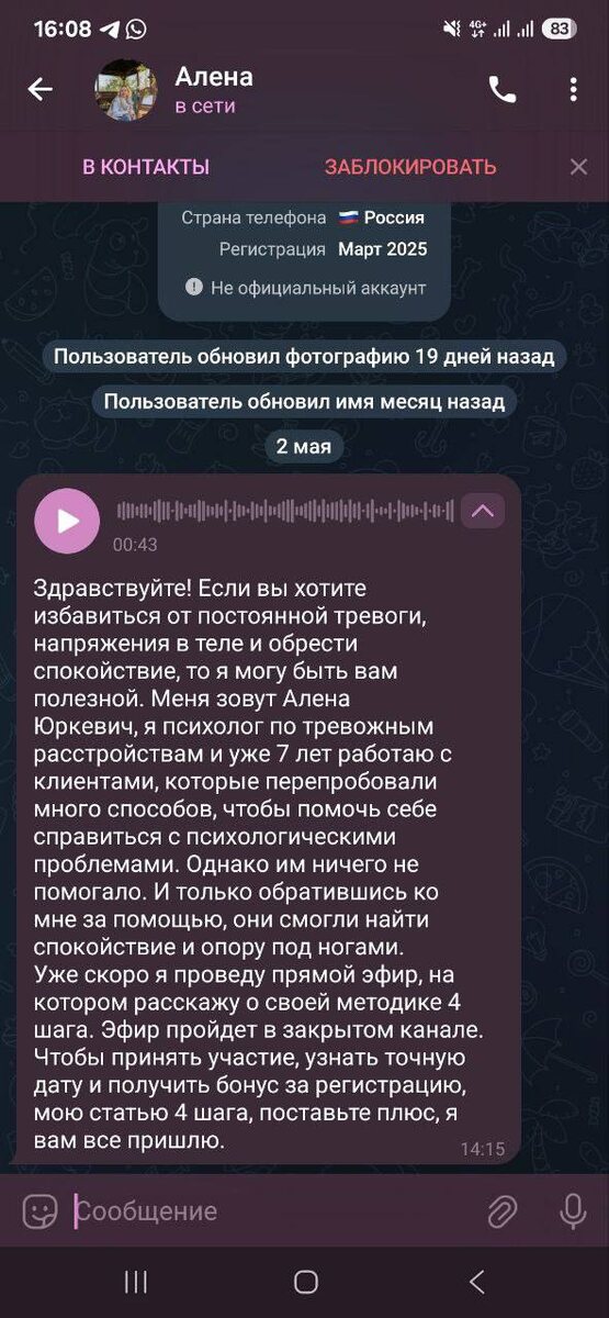 Уважаемые читатели канала, когда вы оставляете комментарии под постами или пишете в нашем пациентском чате @psy03chat, то вам в личку могут писать различные «специалисты», с сомнительными предложениями и откровенные мошенники. Будьте бдительны, мы никогда не пишем первыми и не навязываем свои услуги.