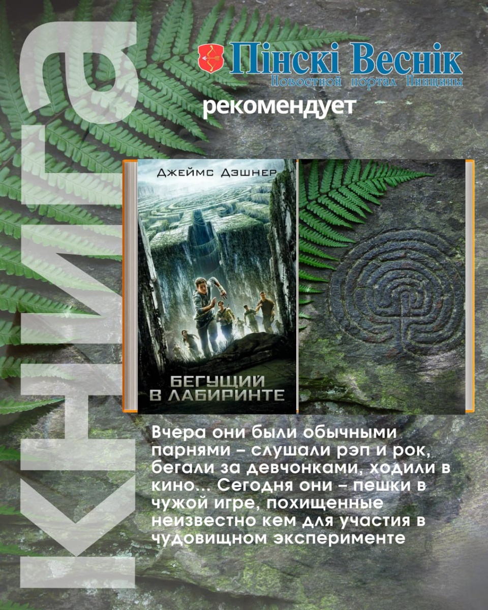 📌Бегущий в Лабиринте - Джеймс Дэшнер Вчера они были обычными парнями – слушали рэп и рок, бегали за девчонками, ходили в кино... Сегодня они – пешки в чужой игре, похищенные неизвестно кем для участия в чудовищном эксперименте. Их память стерта. Их новый дом – гигантский комплекс, отгороженный от еще более огромного Лабиринта стенами, которые раздвигаются утром и замыкаются вечером. И никто еще из тех, кто остался в Лабиринте после наступления ночи, не вернулся... Ребята не сомневаются: если они сумеют разгадать тайну Лабиринта, то вырвутся из заточения и вернутся домой. Но кто рискнет жизнью ради общей цели? Кто пойдет практически на верную смерть? Только двое – паренек по имени Томас и его подруга – Тереза... 📍📍@Пинский Вестник ЮТУБ | САЙТ| ИНСТ | ВК | ОК | ФЕ | Прислать новость