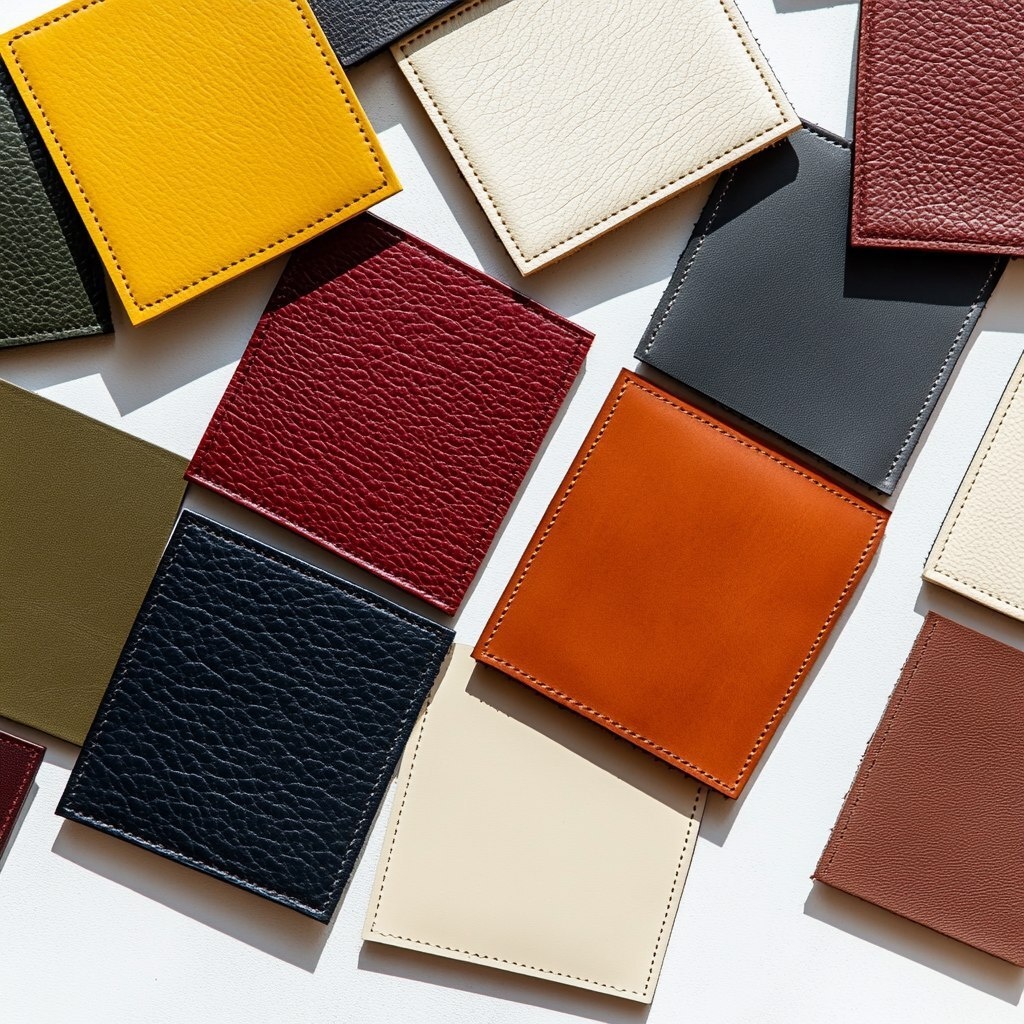 Создано на основе запроса: top view moodboard on white surface with leather swatches of different colors, red, yellow, black, brown, green