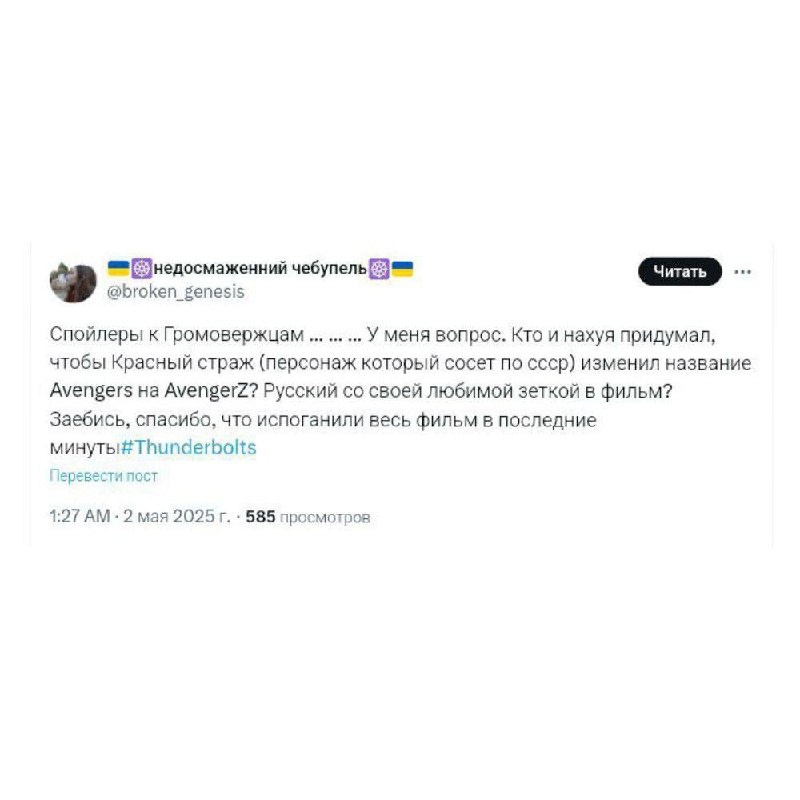 В новом фильме Marvel команда антигероев, ранее известная как «Громовержцы*», официально обзавелась другим именем — «New AvengerZ». Это сразу же вызвало бурные обсуждения в соцсетях. Во время сцены после титров участники решают, как им теперь называться. Поскольку имя «Avengers» уже принадлежит другим героям, Красный Страж — супергерой родом из СССР — предлагает свой вариант: «New AvengerZ» (в переводе — «Мстители Z»). Учитывая происхождение персонажа, выбор названия стал предметом оживлённых дискуссий. Любопытство фанатов долго подогревалось и символом звёздочки в названии «Громовержцы». Как выяснилось, это имя изначально служило лишь временным обозначением команды. Хочешь, сделаю ещё чуть более живо или в стиле для соцсетей?