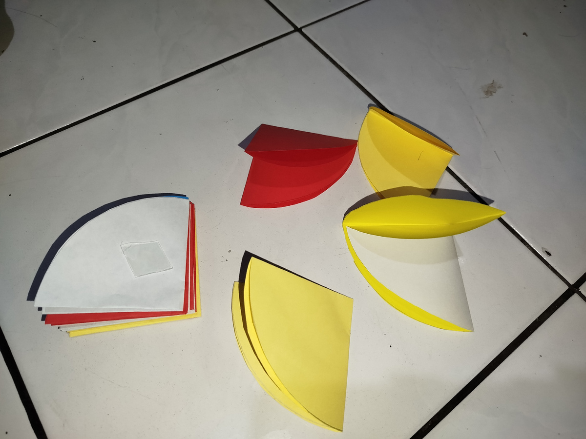 Вырезать 10-12 кружков нужного диаметра (он зависит от длины трубочки). Сложить каждый пополам и ещё раз пополам. Склеить сложенные кружки двусторонним скотчем между собой и каждый во втором сгибе