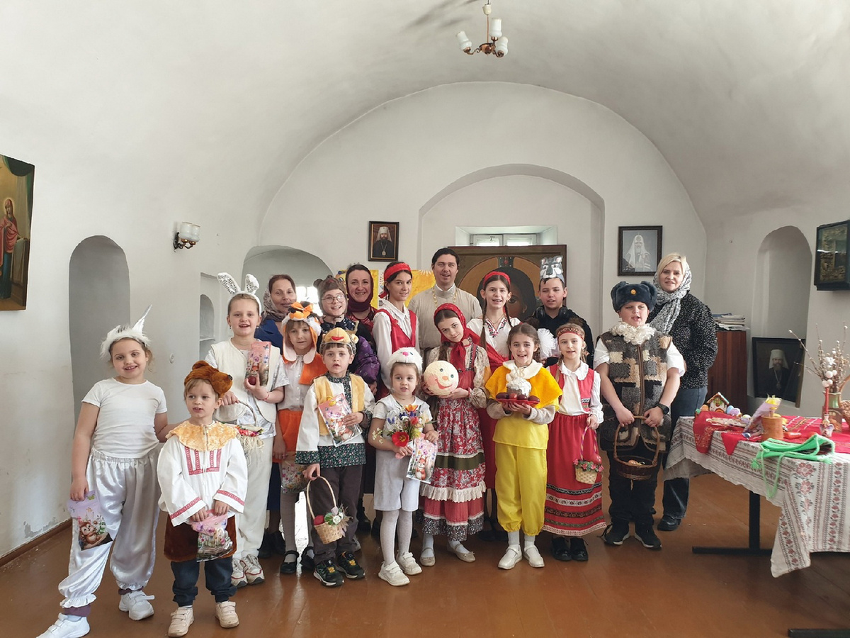 28 апреля 2025 года, к празднику Светлого Христова Воскресения, воспитанники Воскресной школы «Покров» храма Покрова Пресвятой Богородицы на Подворье Псково-Печерского монастыря в городе Пскове представили настоятелю храма с прихожанами прекрасную сказку «Пасхальный колобок». Дети рассказали о том, как правильно праздновать Воскресение Христово, как важно быть добрыми, отзывчивыми и щедрыми.