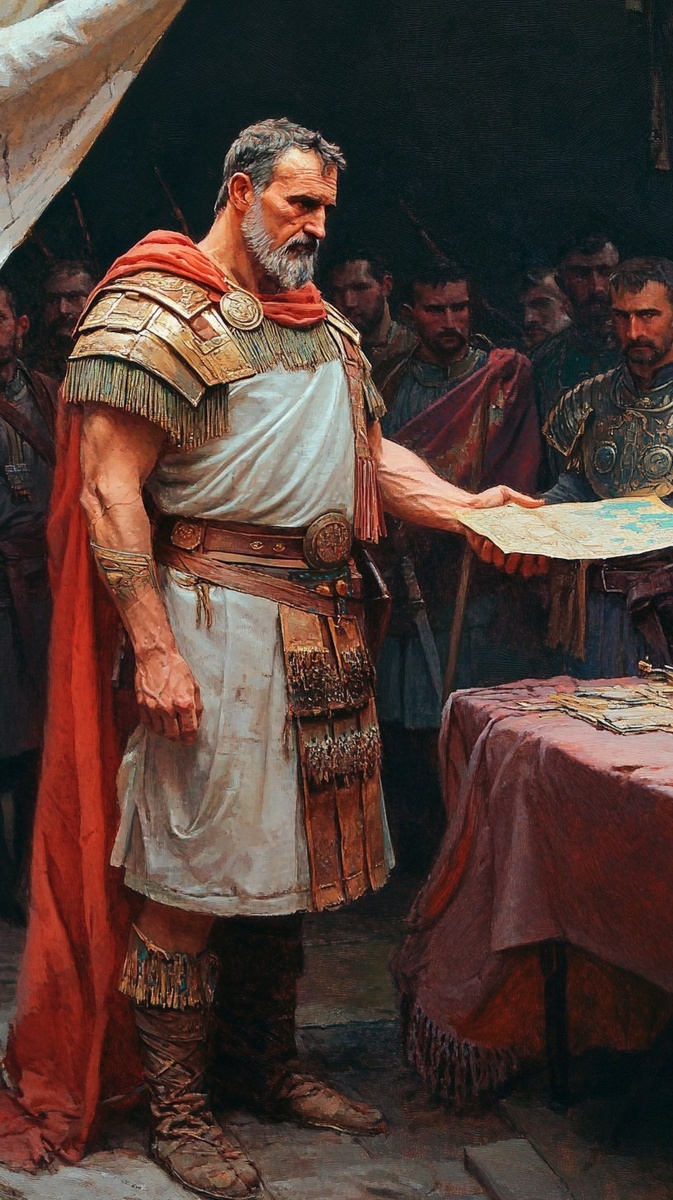 Создано на основе запроса: General Hannibal stands inside a large campaign tent, staring intensely at a map on the table