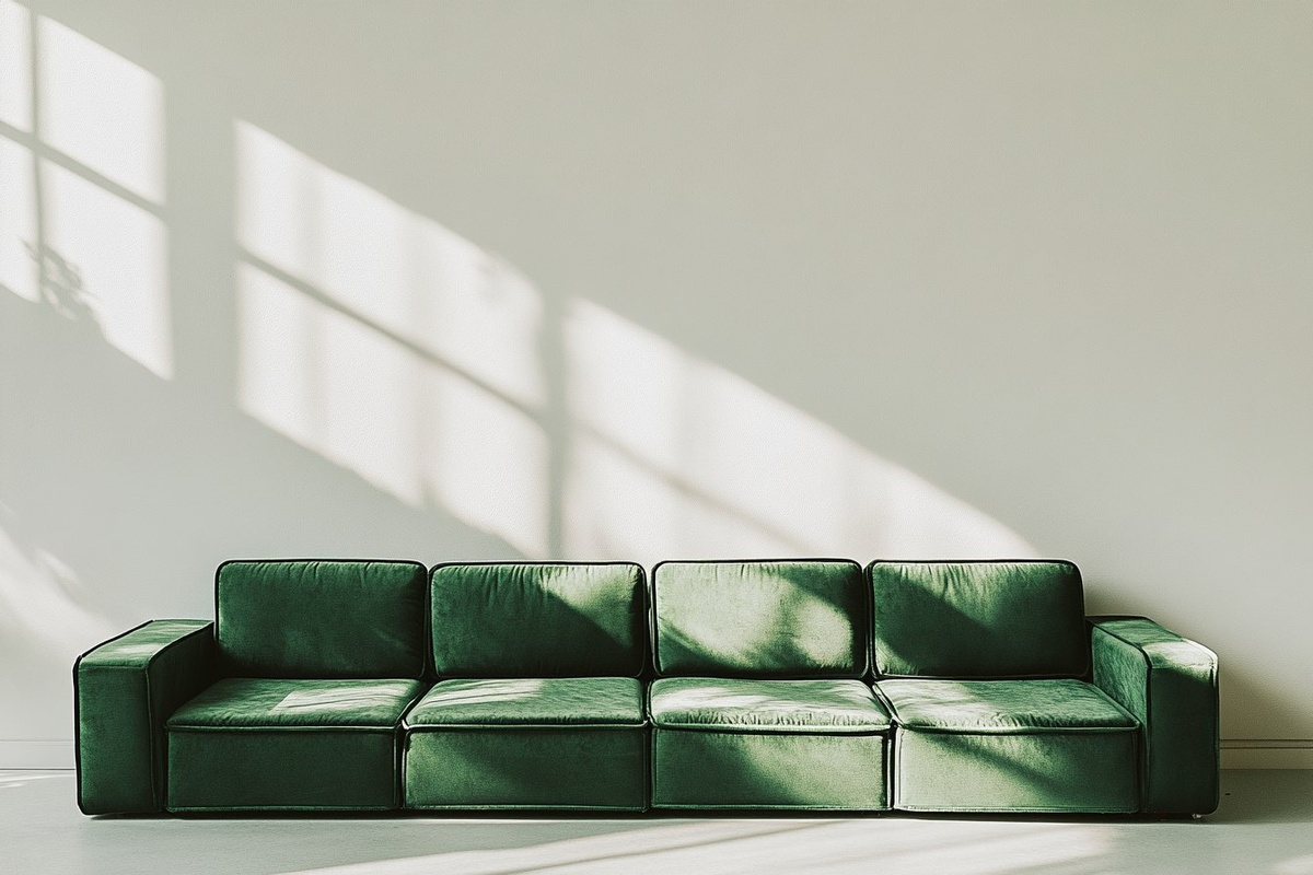 Создано на основе запроса: green sectional sofa, 4 seater, minimalist, rectangular seating and cushions, very basic, luxe, modern, flat base, white background studio shoot