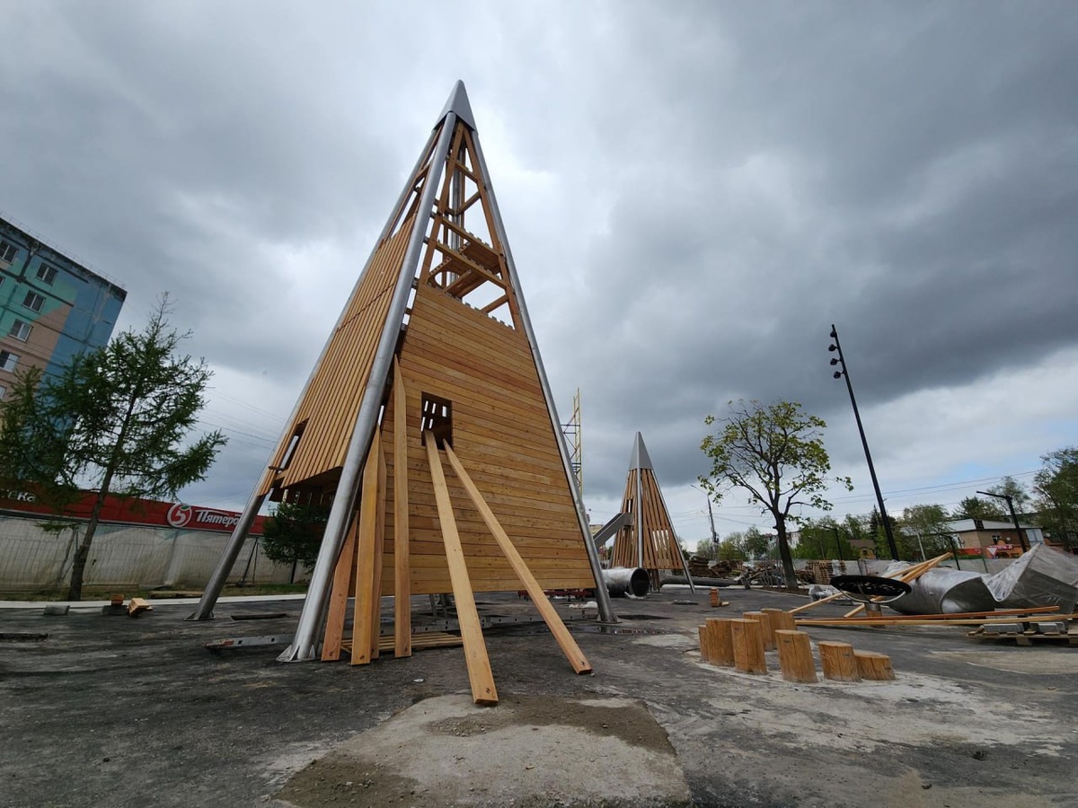 📌В Егорьевске продолжается масштабная реконструкция сквера «60 лет Победы». На этой неделе здесь установили 12-метровую башню, выполненную из дерева.