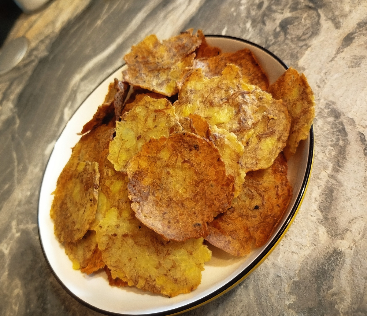 Хрустящие, ароматные, домашние чипсы, станут отличным дополнением к вашему столу. Нам потребуются: Картофель Тушенка Соль по вкусу Чеснок сушеный Приготовление: Картофель отварить до готовности Обжарить картофель на сковороде с тушенкой, добавить сушеный чеснок и соль по вкусу Обжаренный с тушенкой картофель размять в пюре Сформировать шарики диаметром 1-2 см и выложить на предварительно смазанную маслом фольгу или пергамент Накрываем шарики кусочком фольги и расплющиваем при помощи стакана Выпекаем в разогретой до 210°С духовке 20 минут Приятного аппетита 😋