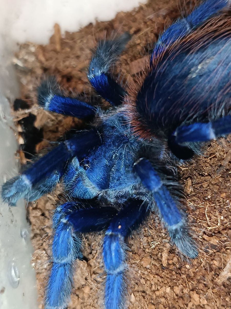 Потрясающая , невероятная Девочка!!! 😍😍😍 Пол узнали только вчера !! Подбираем имя!😘 Pterinopelma sazimai — вид пауков-птицеедов. Встречается в Бразилии, в штате Баия, в местечке Шапада-Диамантина. Некоторые характеристики: 🕷Размер: самки могут достигать 7–8 см в теле и до 17–18 см с учётом размаха лап. 🕷Окрас: в окраске преобладают синие и зелёные оттенки. Брюшко тёмно-синее, волоски отливают красноватым тоном. На спине тёмно-синий цвет переходит почти в фиолетовый и в чёрный в области головы. 🕷Поведение: прячутся под корнями, в густых кустарниках. Некоторые особи любят копать. 🕷Продолжительность жизни самок: около 10 лет. 🕷Питание: являются хищниками и питаются насекомыми. В качестве корма можно использовать сверчков, тараканов, мучных червей и других кормовых насекомых 🕷Яд: Pterinopelma sazimai — ядовитые пауки, но их яд, в большинстве случаев, не опасен для человека. Однако при обращении с ними следует соблюдать осторожность.