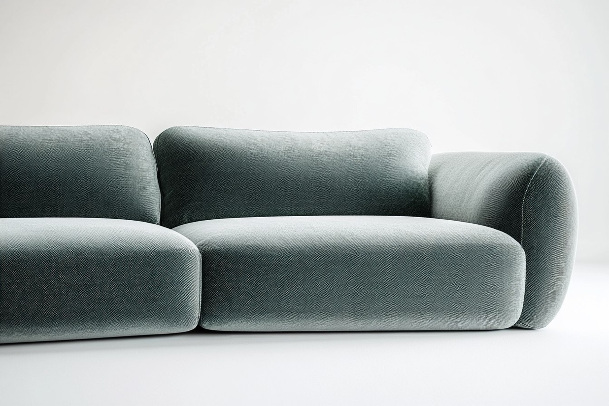 Создано на основе запроса: dark brown 3 seater sofa, modern, green fabric, flatbase, white background studio shoot with cool light product