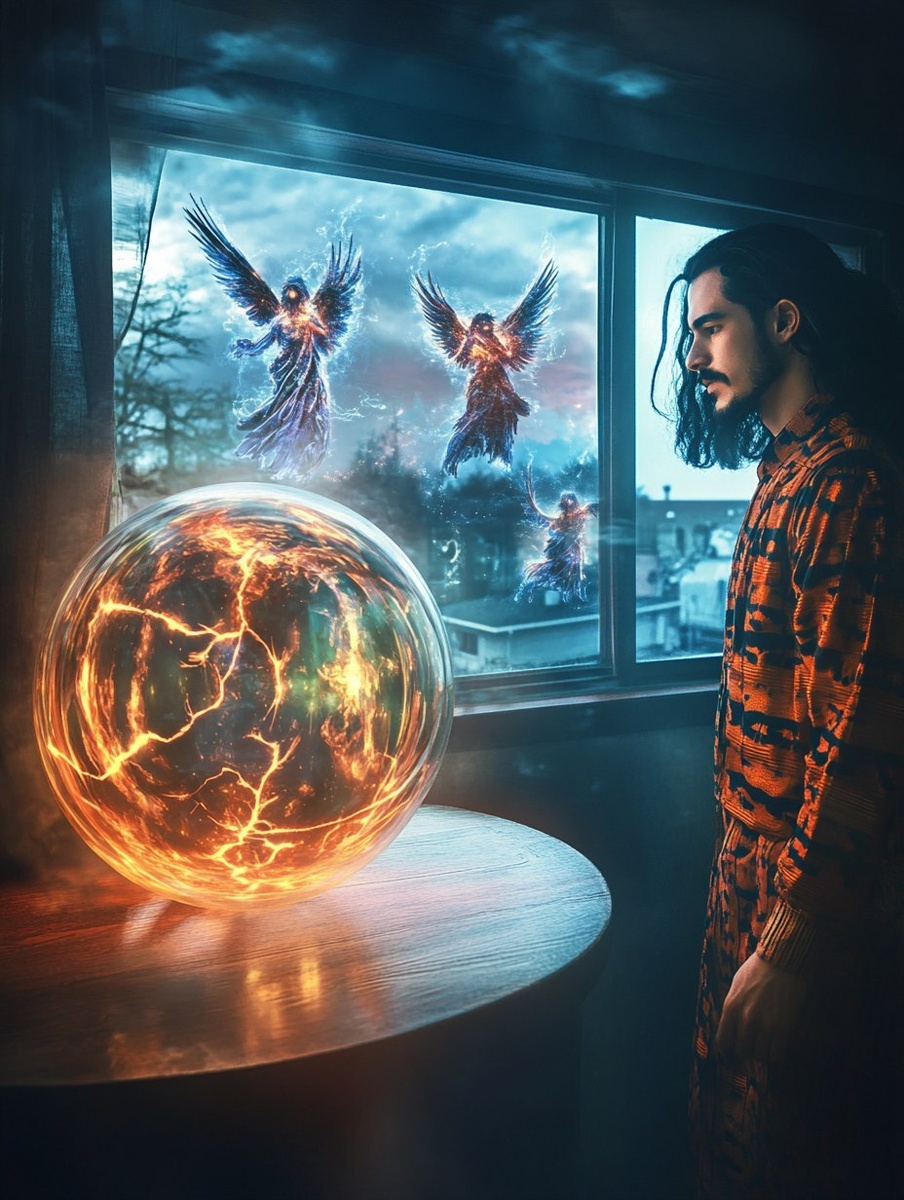 Создано на основе запроса: a photo of a male mystic standing near a glass orb on a wooden table looking out of his bedroom window at the sky in the evening. In the sky are three glowing winged humanoid creatures wearing magigal cloths. One creature is surrounded by fire, the second is surrounded by electricity, the third is surrounded by ice. The sky is vivid and magical. Sony A65 camera.