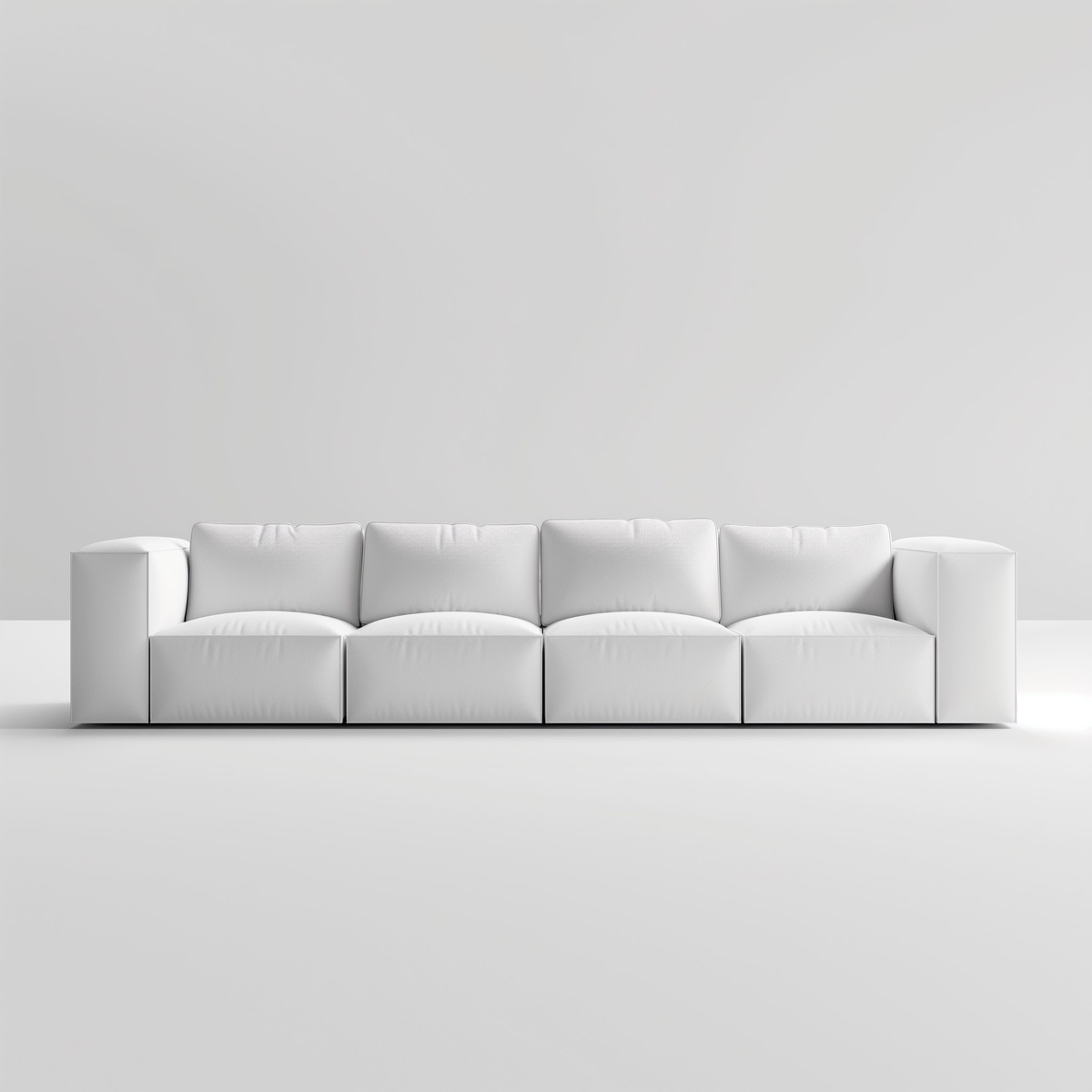 Создано на основе запроса: bright white 4 seater sofa, modern, fabric, stiff soft seating, modular base, white background studio shoot with