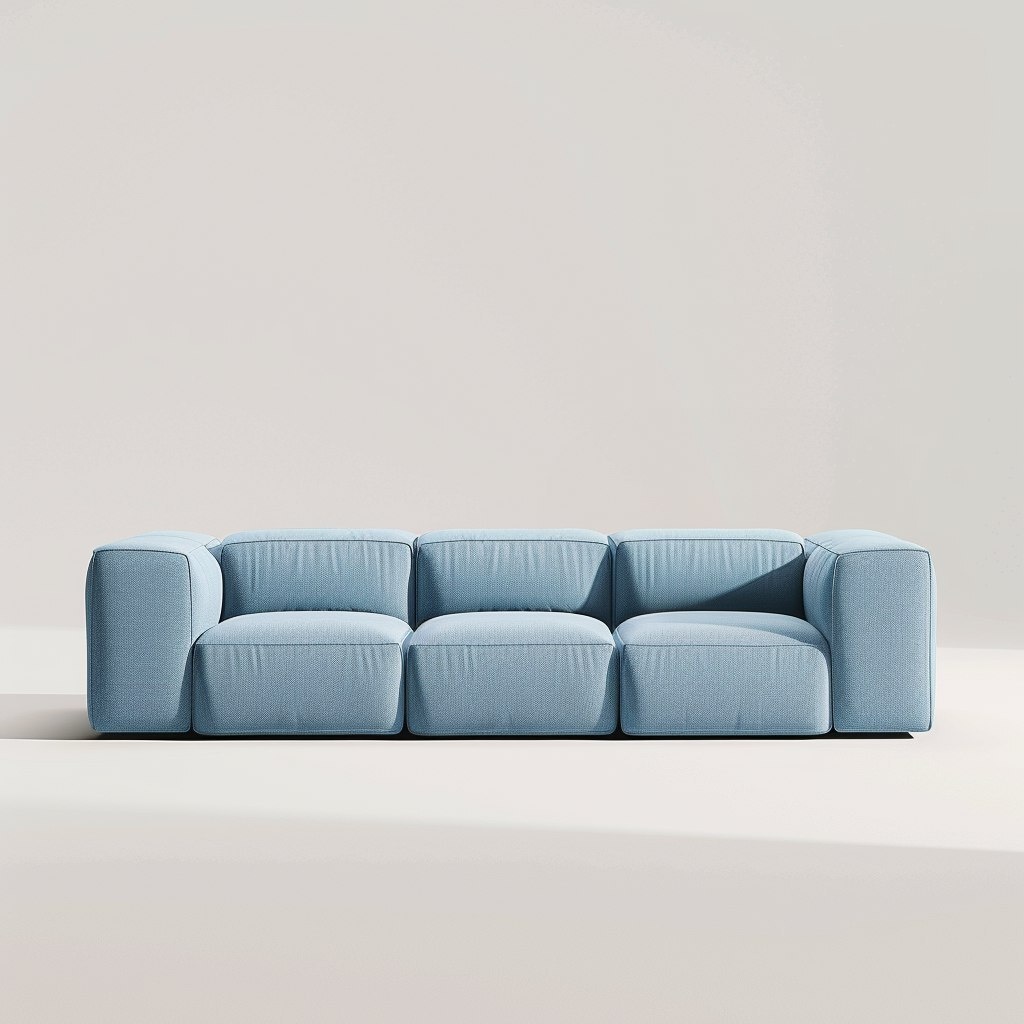 Создано на основе запроса: sky blue 4 seater sofa, modern, fabric, stiff soft seating, modular base, pastel background studio shoot with