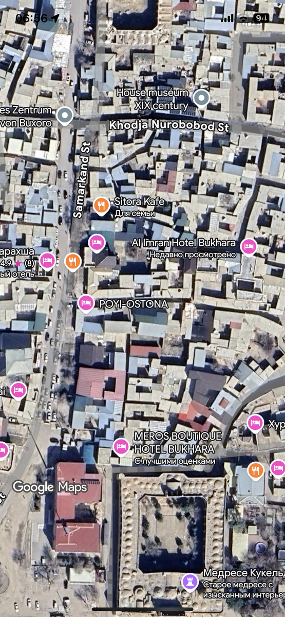 Там уже быстро подъехала заказанная через Яндекс такси машина, которая за 26 минут и за 10 тысяч сум (~73 рубля) довезла нас до отеля Emirxan guest расположенного в самом центре Бухары. Отель расположен в старом городе на узкой улочке, по которой с трудом проедет машина, поэтому такси обычно останавливаются на Samarkand street около отеля Poyi Ostona (см.ниже фрагмент карты Гугл), напротив большой серой двери, идете направо по узкой улочке и впереди увидите указатель к отелю налево, идти метров 70.