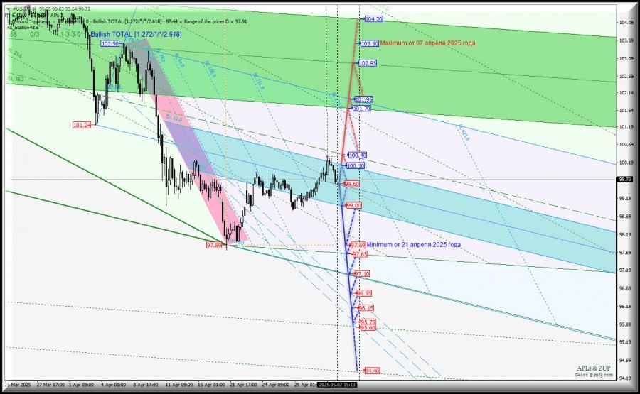 https://basechop.ru/wordpress/?p=41080 Операционный масштаб Minute (таймфрейм h4) #USDX – h4 – обзор вариантов движения с 05 мая 2025 г. Предыдущий обзор #USDX (таймфрейм h4) от 29.04.2025 г. 15:18 ____________________ US Dollar Index Развитие движения индекса доллара – #USDX-h4 – с 05 мая 2025 года станет определяться отработкой и направлением пробоя границ зоны равновесия (99.00 – 00.60 – 100.10) вил младшего операционного масштаба Minuette-h1. Нисходящее движение. При возврате #USDX ниже срединной линии Median Line Minuette-h1 – пробой уровня поддержки 99.60 – развитие движения US Dollar Index будет направлено к нижней границе ISL38.2 (99.00) зоны равновесия вил младшего операционного масштаба Minuette-h1, при пробое которой нисходящее движение данного инструмента может быть продолжено к целям: – minimum 97.89 от 21 апреля 2025 года; – начальная линия SSL (97.65) вил старшего операционного масштаба Minute-h4; – начальная линия SSL Minuette-h1 (97.10); с последующим вариан