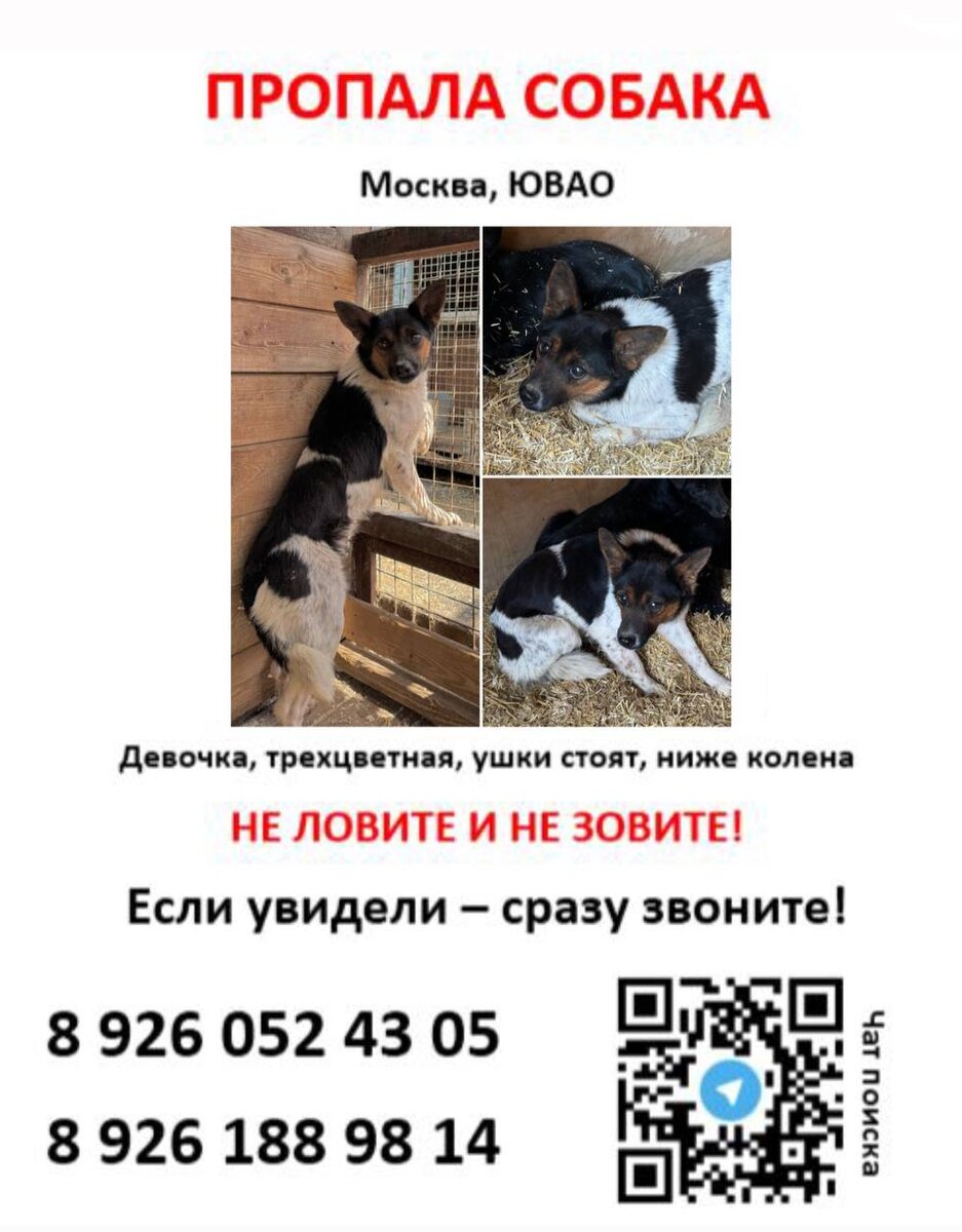 ПРОПАЛА СОБАКА МОСКВА, ЮВАО Девочка, трехцветная, ушки стоят, ниже колена Дата побега: 2.05.2025 Адрес: 2-Вольская 17с3 Время: 9:15 СОБАКА ПУГЛИВАЯ!!!! Не пытайтесь ловить или звать! Сразу звоните: 8 926 052 43 05 8 926 188 98 14 Чат поиска: https://t.me/poisk_myry —— #пропаласобака #убежаласобака