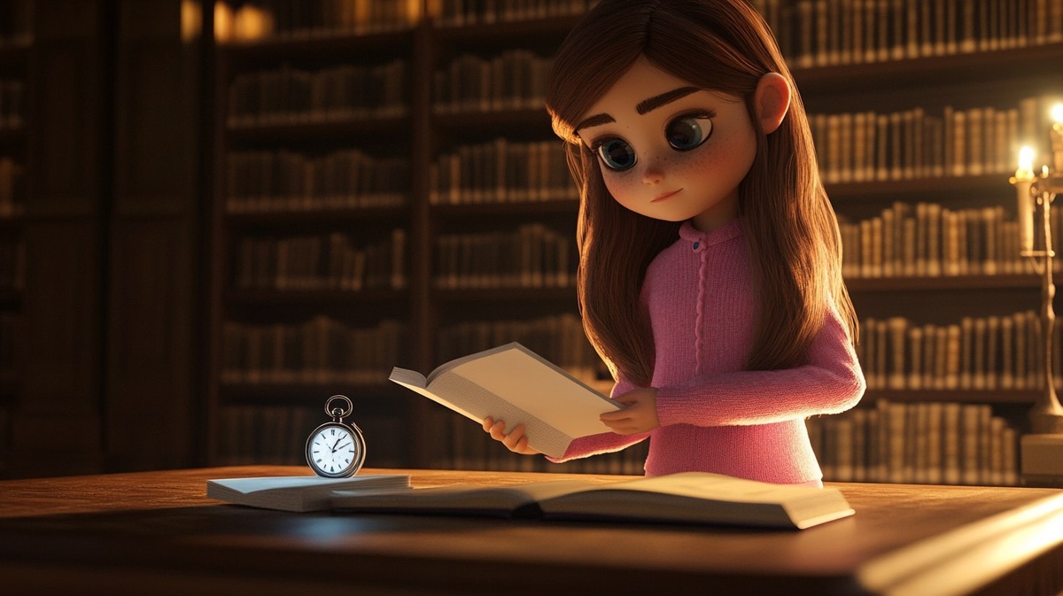 Создано на основе запроса: 3D render of a young girl in a warm, old library gently closing her notebook on a wooden desk, tidying up papers