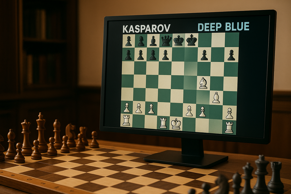 Гарри Каспаров, чемпион мира по шахматам с 1985 года, считался непобедимым. Его соперник, Deep Blue, — это суперкомпьютер, созданный IBM, способный анализировать до 200 миллионов ходов в секунду. Первый матч в 1996 году в Филадельфии Каспаров выиграл со счётом 4–2, хотя Deep Blue победил в первой игре, впервые в истории обыграв действующего чемпиона в классических шахматах. Но в 1997 году в Нью-Йорке всё изменилось: после напряжённой борьбы Deep Blue одержал победу со счётом 3½–2½, став первым компьютером, победившим чемпиона мира в полноценном матче.