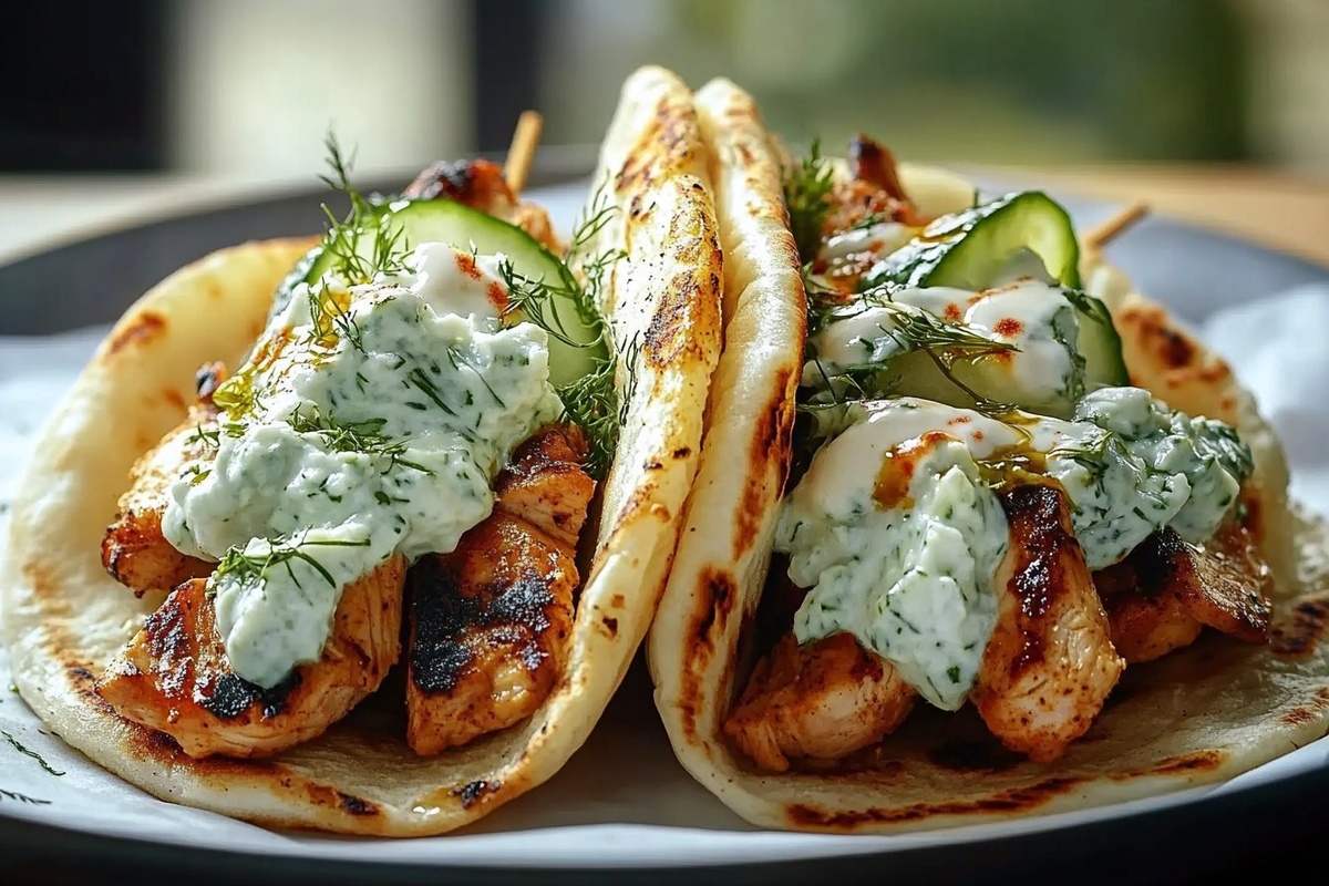 Создано на основе запроса: | Title: Greek Chicken Gyros with Cucumber Tzatziki | STYLE: Close-up Shot right view | EMOTION: realistic as