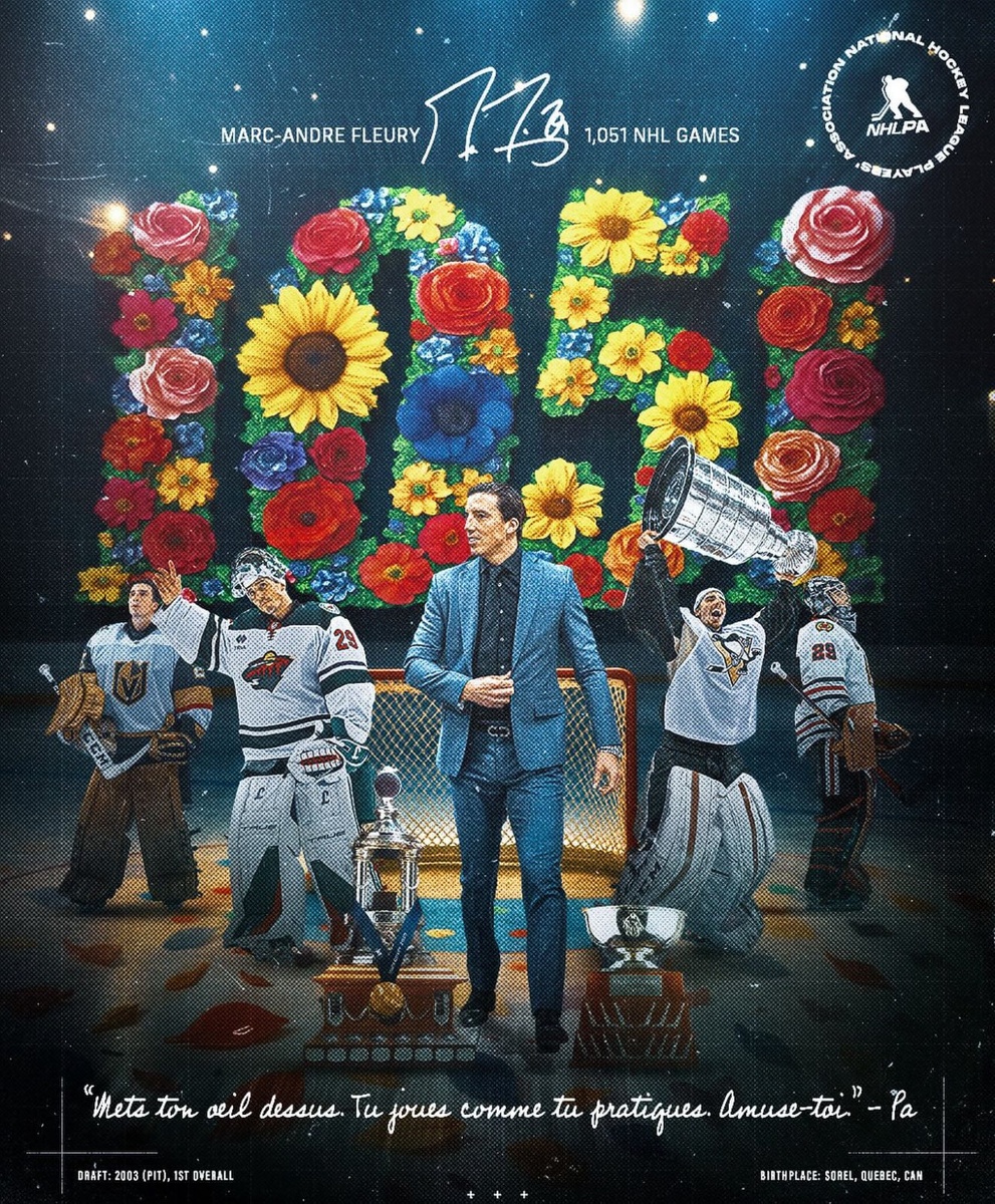 🌺 Ушла на пенсию легенда. Марк-Андре Флёри завершил карьеру. 1-й номер драфта 2003 года; Олимпийский чемпион; Дважды серебряный призёр U-20; Обладатель Везина Трофи; Обладатель Дженнингс Трофи; Трёхкратный обладатель Кубка Стэнли. В плей-офф: 170 игр: 3-е место в истории; 92 победы: 4-е место; 91,1 % отражённых: 12-е место в истории среди вратарей, сыгравших минимум 100 игр в плей-офф, а также 4-е место среди тех, кто сыграл минимум 150 игр; 2,56 шайбы за игру: 14-е место среди вратарей, сыгравших минимум 100 игр в плей-офф, а также 4-е место среди тех, кто сыграл минимум 150 игр; 16 шатаутов: 4-е место. В сезонах: 1051 игра: 2-е место; 1017 стартов: 2-е место; 575 побед: 2-е место; 27188 сейвов: 3-е место; 91,2 % отражённых: 10-е место среди вратарей, сыгравших минимум 700 игр, а также 3-е среди тех, кто провёл более 1000 матчей; 2,6 шайбы за игру: 15-е место среди вратарей, сыгравших минимум 700 игр, а также 4-е среди тех, кто провёл более 1000 матчей; 76 шатаутов: 9-е место;