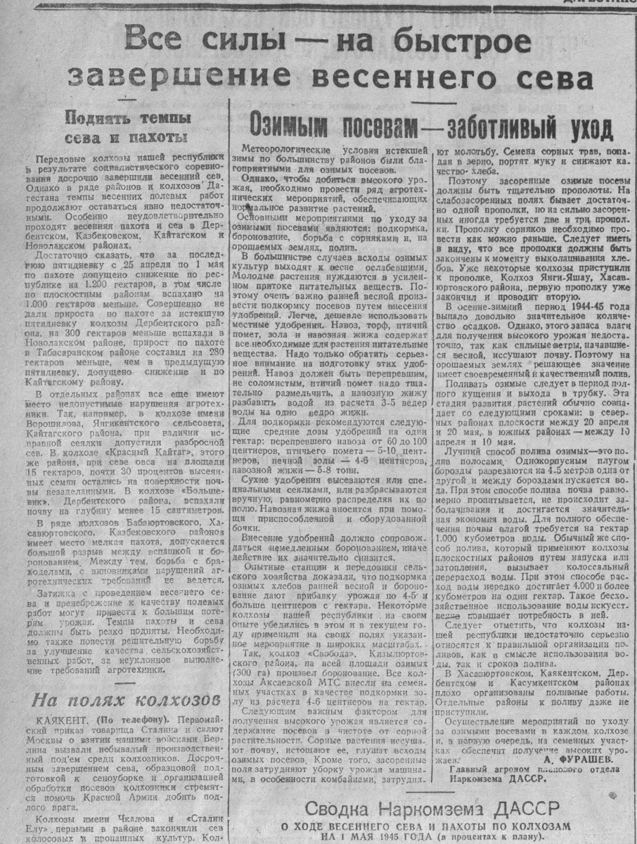 Поднять темпы сева и пахоты Передовые колхозы республики досрочно завершили весенний сев. Однако в Дагестане темпы работ остаются недостаточными, особенно в Дербентском, Казбековском, Кайтагском и Новолакском районах. За последнюю пятидневку (25 апреля – 1 мая) пахота снизилась на 1200 гектаров, в том числе на 1000 гектаров в плоскостных районах. Колхозы Дербентского района не увеличили пахоту, в Новолакском – вспахали на 300 гектаров меньше, в Табасаранском – на 280 гектаров меньше, чем в предыдущей пятидневке, в Кайтагском также допущено снижение. В некоторых районах нарушаются агротехнические требования: в колхозе имени Ворошилова Кайтагского района при исправной сеялке сев проводился разбросным способом, в колхозе «Красный Кайтаг» 30% семян остались на поверхности, в колхозе «Большевик» Дербентского района вспашка проведена на глубину менее 15 см. В Бабаюртовском, Хасавюртовском и Казбековском районах наблюдается мелкая пахота и разрыв между вспашкой и боронованием. Борьба с наруше