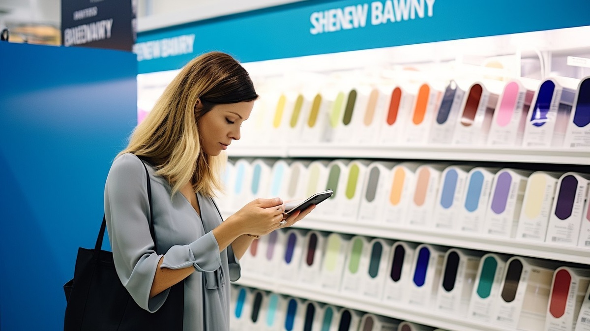 Создано на основе запроса: woman standing in store looking at navy blue paint swatches, AgfaPhoto CT Precisa 100, cinematic photography