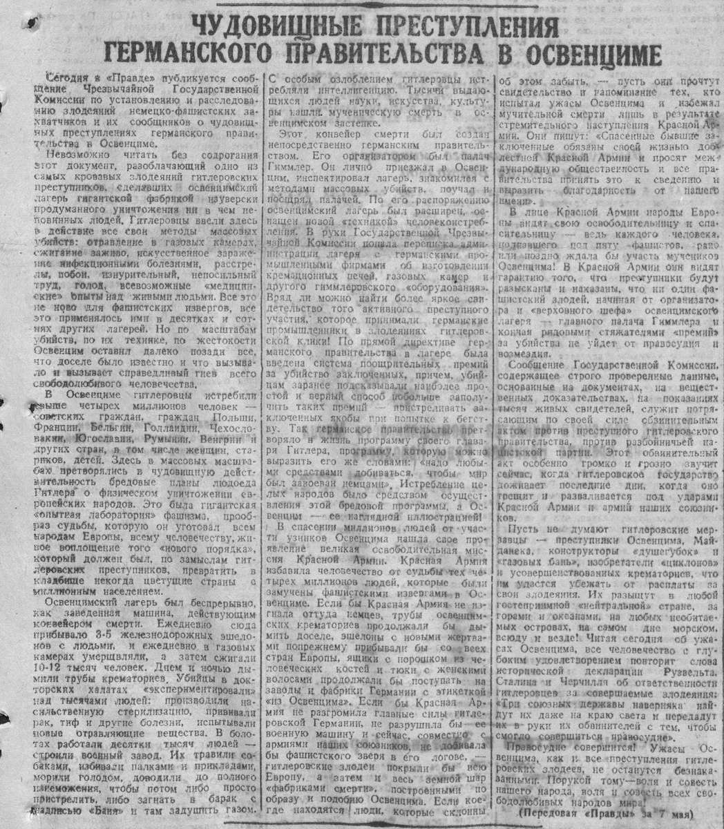 Сегодня в «Правде» публикуется сообщение Чрезвычайной Государственной Комиссии по установлению и расследованию злодеяний немецко-фашистских захватчиков и их сообщников о чудовищных преступлениях германского правительства в Освенциме.
