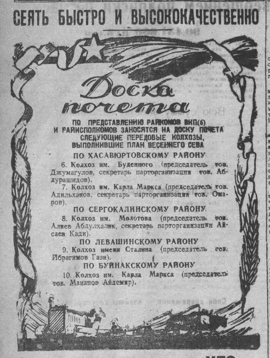 ПО ПРЕДСТАВЛЕНИЮ РАЙКОМОВ ВКП(б) И РАЙИСПОЛКОМОВ ЗАНОСЯТСЯ НА ДОСКУ ПОЧЕТА СЛЕДУЮЩИЕ ПЕРЕДОВЫЕ КОЛХОЗЫ, ВЫПОЛНИВШИЕ ПЛАН ВЕСЕННЕГО СЕВА ПО ХАСАВЮРТОВСКОМУ РАЙОНУ. 6. Колхоз им. Буденного (председатель тов. Джумагулов, секретарь парторганизации тов. Абдурашидов). 7. Колхоз им. Карла Маркса (председатель тов. Адильханов, секретарь парторганизации тов. Омаров). ПО СЕРГОКАЛИНСКОМУ РАЙОНУ. 8. Колхоз им. Молотова (председатель тов. Алиев Абдулхалик, секретарь парторганизации Айсаев Кади). ПО ЛЕВАШИНСКОМУ РАЙОНУ. 9. Колхоз имени Сталина (председатель тов. Ибрагимов Гази). ПО БУЙНАКСКОМУ РАЙОНУ. 10. Колхоз им. Карла Маркса (председатель тов. Манапов Айдемир). Источник: "Дагестанская правда" за 8 мая 1945 года