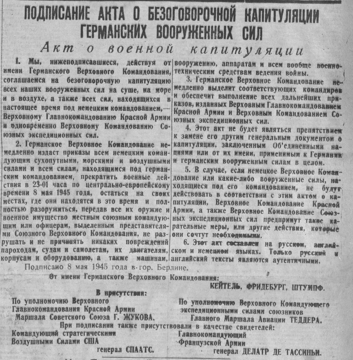 ПОДПИСАНИЕ АКТА О БЕЗОГОВОРОЧНОЙ КАПИТУЛЯЦИИ ГЕРМАНСКИХ ВООРУЖЕННЫХ СИЛ Акт о военной капитуляции 1. Мы, нижеподписавшиеся, действуя от имени Германского Верховного Командования, соглашаемся на безоговорочную капитуляцию всех наших вооруженных сил на суше, на море и в воздухе, а также всех сил, находящихся в настоящее время под немецким командованием, Верховному Главнокомандованию Красной Армии и одновременно Верховному Командованию Союзных экспедиционных сил. 2. Германское Верховное Командование немедленно издаст приказы всем немецким командующим сухопутными, морскими и воздушными силами и всем силам, находящимся под германским командованием, прекратить военные действия в 23-01 часа по центрально-европейскому времени 8 мая 1945 года, остаться на своих местах, где они находятся в это время и полностью разоружиться, передав все их оружие и военное имущество местным союзным командующим или офицерам, выделенным представителями Союзного Верховного Командования, не разрушать и не причинять