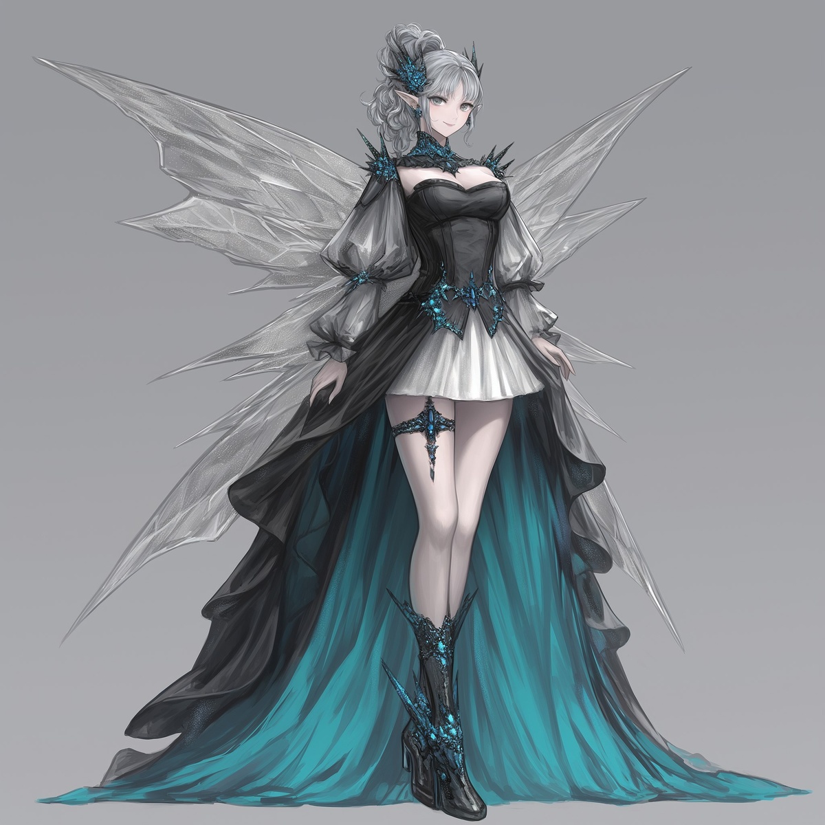 Создано на основе запроса: Full-length fairy girl with snow-white hair and brown eyes, dressed in a beautiful dress with crystals and