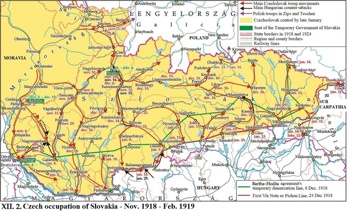 Это продолжение цикла о формировании современных границ Чехии и Словакии. Начало – здесь. 2 ноября 1918 г. чехословацкий батальон под командованием надпоручика Бауэра перешел венгерскую границу и так началось формирование, собственно, территории Чехословакии. В течение ноября-декабря чехословацкие войска заняли большую часть современной Словакии: Состояли они из добровольцев, солдат, вернувшихся с фронта, и членов сокольского движения. Обычно их продвижение не встречало особого сопротивления деморализованной венгерской армии. 6 декабря была согласована линия временной демаркации (линия Барта-Годжи), примерно соответствующая венгерско-словацкой этнической границе. 23 декабря Антанта потребовала сместить ее южнее (лииня Пишона): Интересно, что в этих условиях часть словаков не хотела ни в какую Чехословакию. 11 декабря в Кошице была провозглашена Словацкая народная республика, декларировавшая сохранение теснейших связей с Венгрией. Ее лидером стал журналист и депутат венгерского парламен