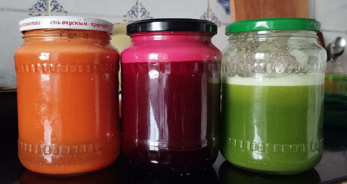 Вчера мы попробовали сразу три различных свежевыжатых сока! Морковно-яблочный, свекольно-яблочный и огуречно-сельдереевый с зелёной редькой и зеленушкой). На тарелках я показала состав и количество моих ингредиентов. Вот из такого объёма получается почти 800 граммов сока. Но кроме этого остаётся и жмых. Многие жмых выбрасывают — но для меня это неприемлемо. Я всю жизнь ем сырые салаты, даже из свёклы и редьки, меня жмыхом не напугать :) Второй день добавляю его в различные блюда. А сегодня поделюсь с вами рецептом лепёшек из жмыха. МОРКОВНО- КАРТОФЕЛЬНО- ЛЬНЯНЫЕ ЛЕПЁШКИ! Вам понадобится: