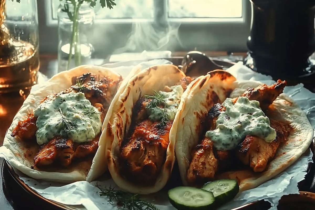 Создано на основе запроса: | Title: Greek Chicken Gyros with Cucumber Tzatziki | STYLE: Close-up Shot right view | EMOTION: realistic as