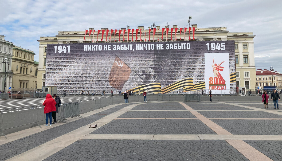 В преддверии празднования 80-летия Победы на Дворцовой площади разместили гигантское панно, составленного из нескольких тысяч портретов ветеранов Великой Отечественной войны. Это проект реализован Комитетом по печати и взаимодействию со средствами массовой информации Санкт-Петербурга и «Городским центром рекламы и праздничного оформления» совместно с движением «Бессмертный полк России». С инициативой создания панно выступило руководство города, а региональное движение «Бессмертного полка» помогло с предоставлением фотографий. Директор «Городского центра рекламы и праздничного оформления» Андрей Чистяков рассказал «Петербургскому дневнику»: «Размер панно составит 65 на 18 метров. На нем будут размещены 4500 портретов ветеранов Великой Отечественной войны. Внутри панно оборудован светодиодный экран размером 23 на 13 метров. На нем будет вестись 9 мая трансляция Парада Победы, а затем трансляция шествия «Бессмертного полка», покажут кадры торжественного оформления города. Также на экране
