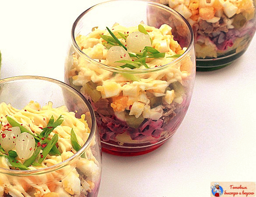 Пусть это немного сложнее, чем просто все перемешать, зато будет выглядеть очень эффектно и празднично. Готовим закуску заранее и ставим для пропитки в холодильник. Ингредиенты для салата: Расчет примерно на 8 порций Шаг 1 Тунец можете брать в собственном соку или в масле. Картофель, яйца и свеклу лучше отварить заранее. Как вариант: овощи приготовить в микроволновке. Зелёный и белый лук используем для украшения. Они прекрасно подходят по вкусу. Маринованного лука можно взять больше. Шаг 2 Огурцы надо нарезать небольшим кубиком, а красный лук кубиком еще мельче. Шаг 3 И опять же кубиками нарезать яйца и картофель. Удобно и быстро использовать специальный гаджет для нарезки. Шаг 4 Теперь нужно собрать рыбный салат. Стаканы лучше брать пошире, чтобы было удобно выкладывать продукты. Итак, на