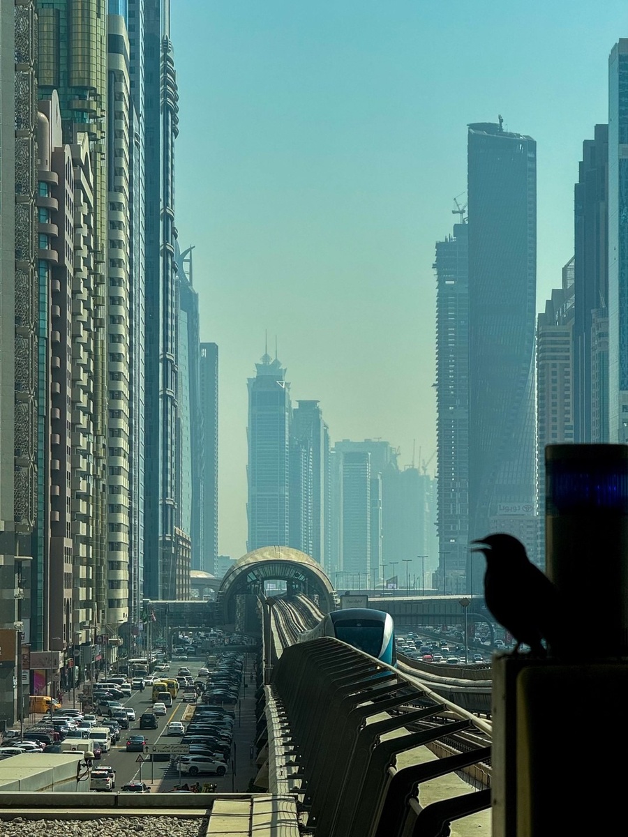 Ворона смотрит на каменные джунгли Дубая Апрель 2025 iPhone pro max