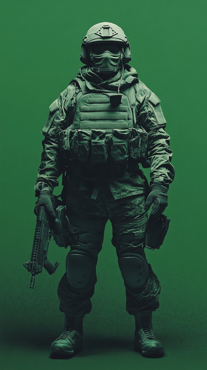 Создано на основе запроса: hyper-realistic futirist soldier on a green background, from top to toes